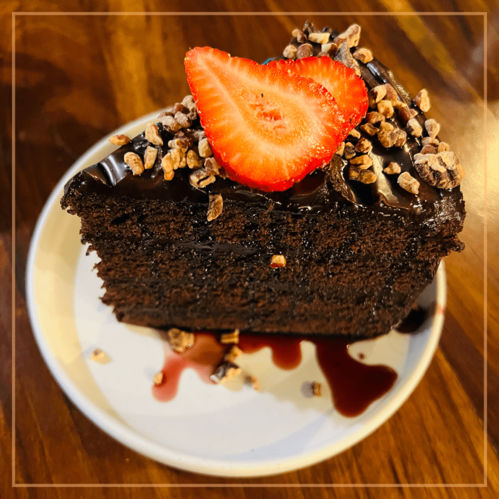 Pastel de Chocolate • Reducción de Vino Tinto • Fresa • Nuez